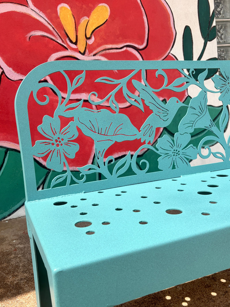 Add a touch of magic to your outdoor space with our Hummingbird Bench! Featuring a lovely hummingbird and spring flowers, this Fountain Green powder coated bench is both stunning and playful.